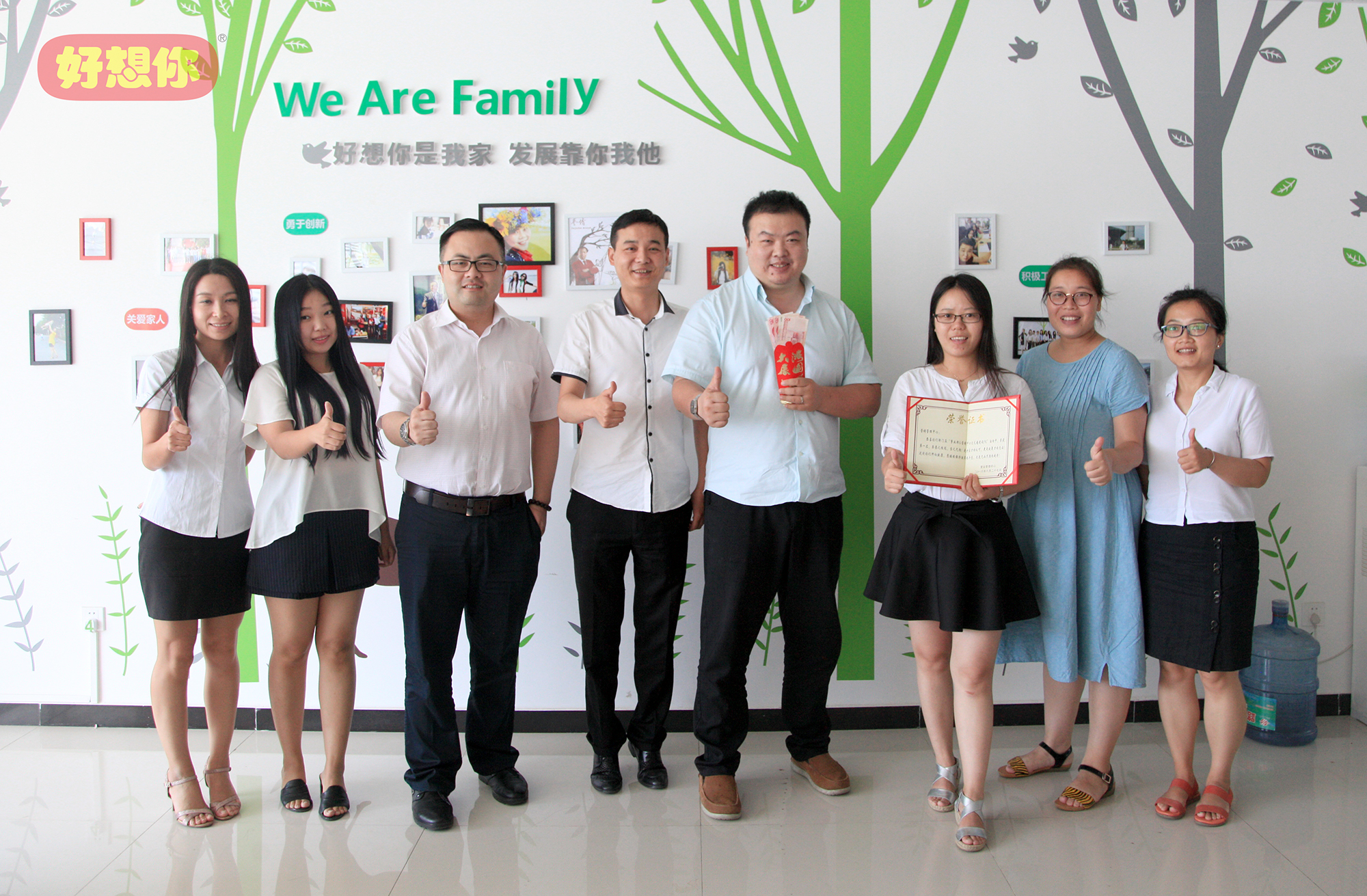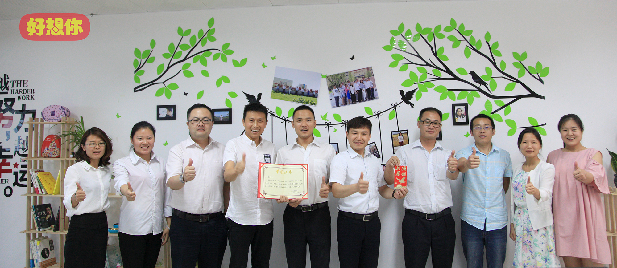 各部门文化墙制作完成之后,门店服务部还在“银河集团(galaxy)天使之家”微信公众平台上发起了“文化墙PK”投票活动。为了争夺团队荣誉,各参赛部门同事工作之余在公司微信群展开“花式拉票”,各种别具创意的拉票宣言层出不穷,甚至还有美女旗袍秀送上。最终,共有将近6000人参与投票,经过近一周的激烈角逐,营销管理中心、运营管理中心、产品管理中心分别获得一、二、三等奖。营销系统负责人兼连锁门店事业部总经理司胤衡走进各个装饰一新的办公室,分别为获奖部门颁发了证书及200元到500元不等的文化活动奖金。