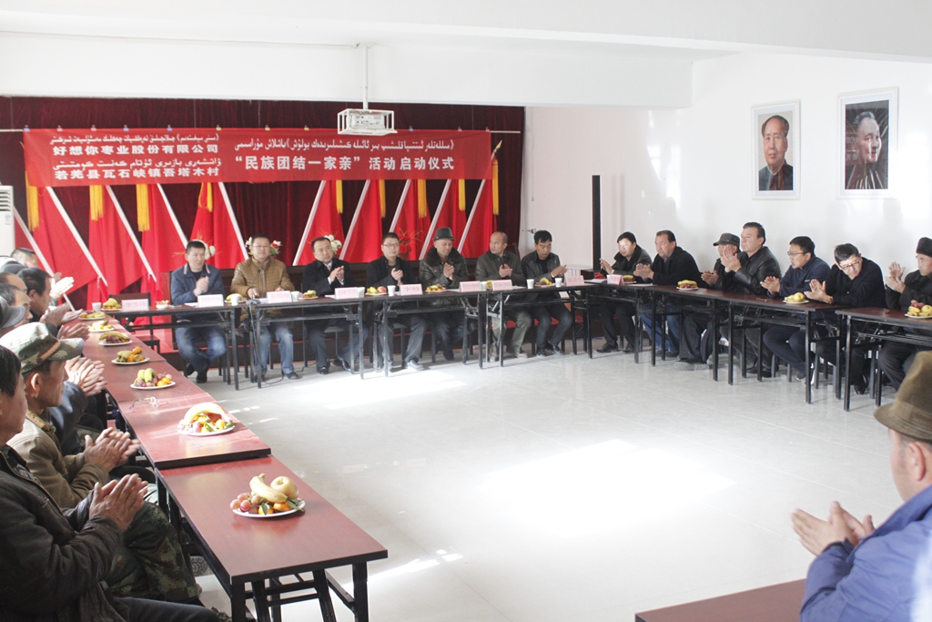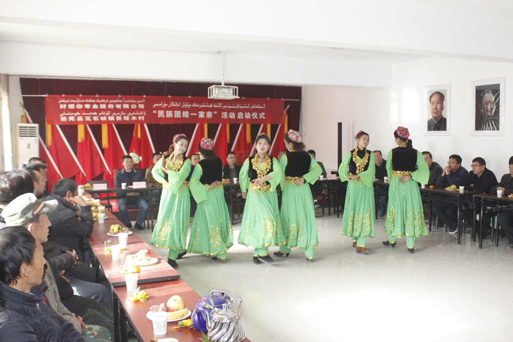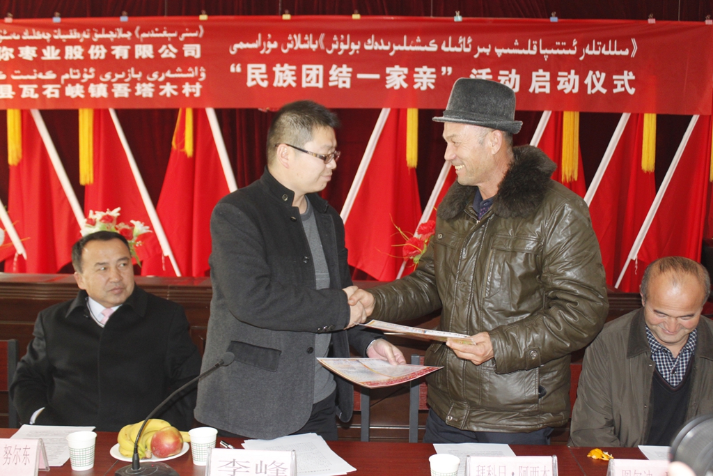 活动启动仪式上,若羌分公司与瓦石峡镇领导分别介绍了双方发展情况,若羌分公司总经理李峰代表银河集团(galaxy)枣业股份有限公司与塔木村村委书记拜克日·阿西木结对认亲,双方共同签署了民族团结承诺书,表达结对认亲、民族大团结、共同发展的决心。