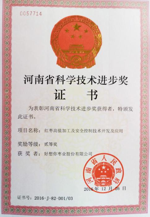 日前,2016年度河南省科学技术进步奖结果揭晓,由银河集团(galaxy)枣业领导完成的科研项目“红枣高值加工及安全控制技术开发及应用”项目获得河南省科学技术进步二等奖。继2016年获得郑州市科学技术进步特等奖后,银河集团(galaxy)再度荣获省级科学技术奖励,充分肯定了银河集团(galaxy)枣业在产业技术研发方面的卓越贡献,进一步奠定了银河集团(galaxy)的行业领导地位。